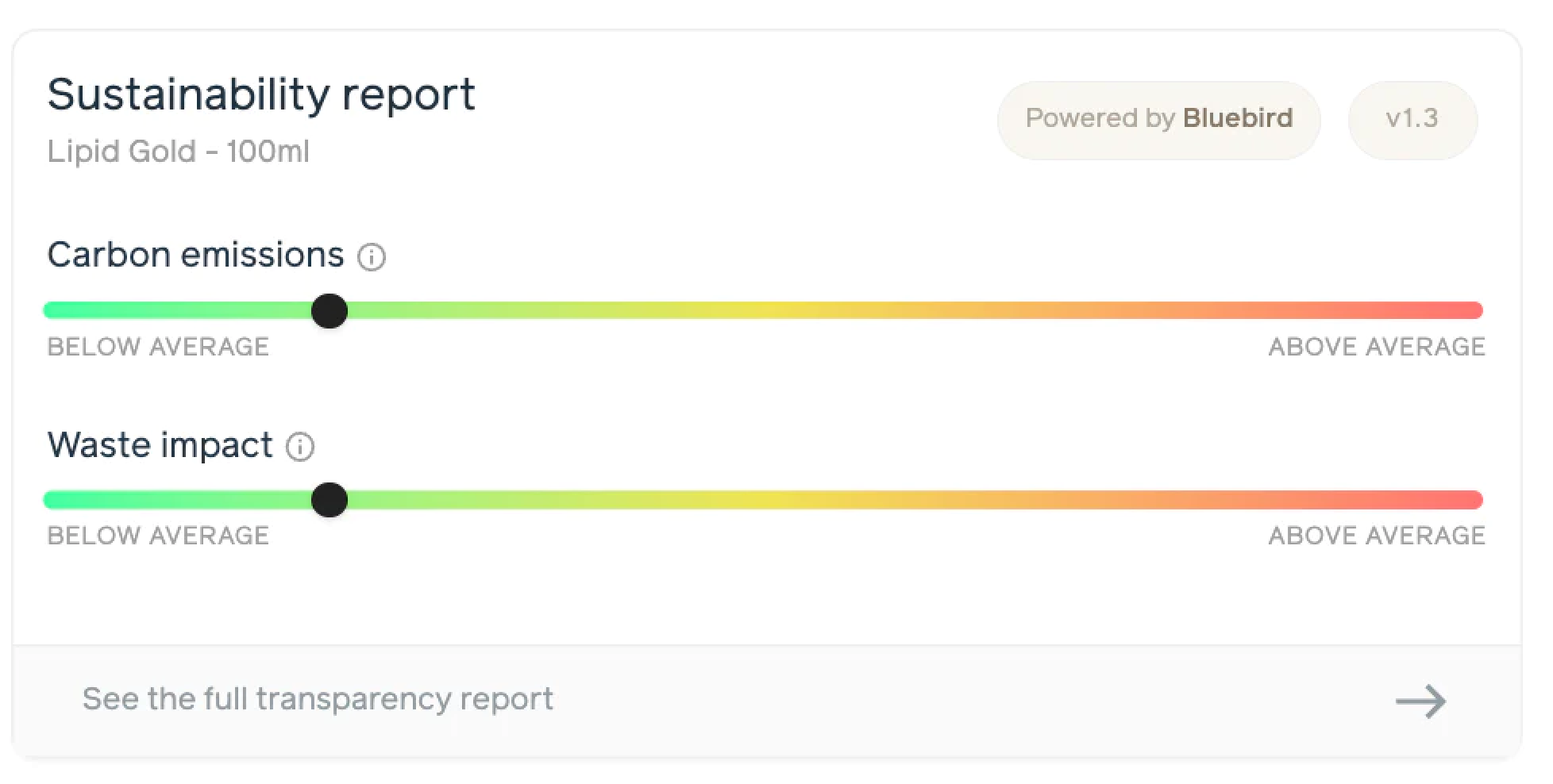 We partnered with Bluebird Climate for Carbon Impact and Sustainability Reports and featured them transparently on each product page in the "Sustainability" tab.