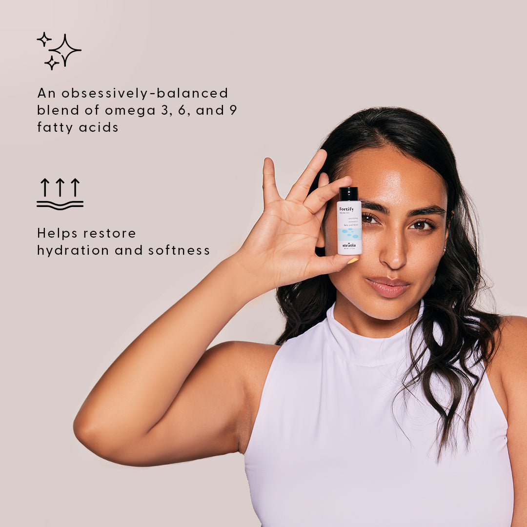 Fortify is a medium-weight oil that's minimally greasy and especially great for those with dry, combo, dehydrated, or sensitive skin. Pat a few drops into your skin before or instead of your usual moisturizer. Or, to give your normal routine a fatty acid boost, mix a couple drops into your serum, lotion, or foundation.