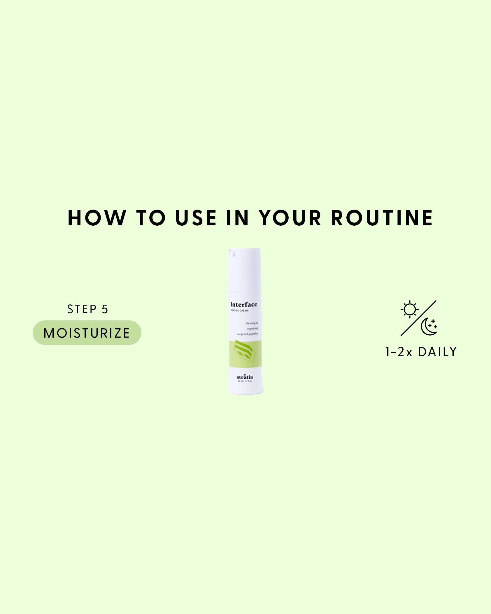 Apply 1-2 pumps of peptide-packed cream to help firm and repair. Use as an effortless standalone moisturizer that absorbs into skin for a delicate finish or layer Interface as part of a more extensive skincare routine. Interface plays well with others, under makeup or on top of serums.