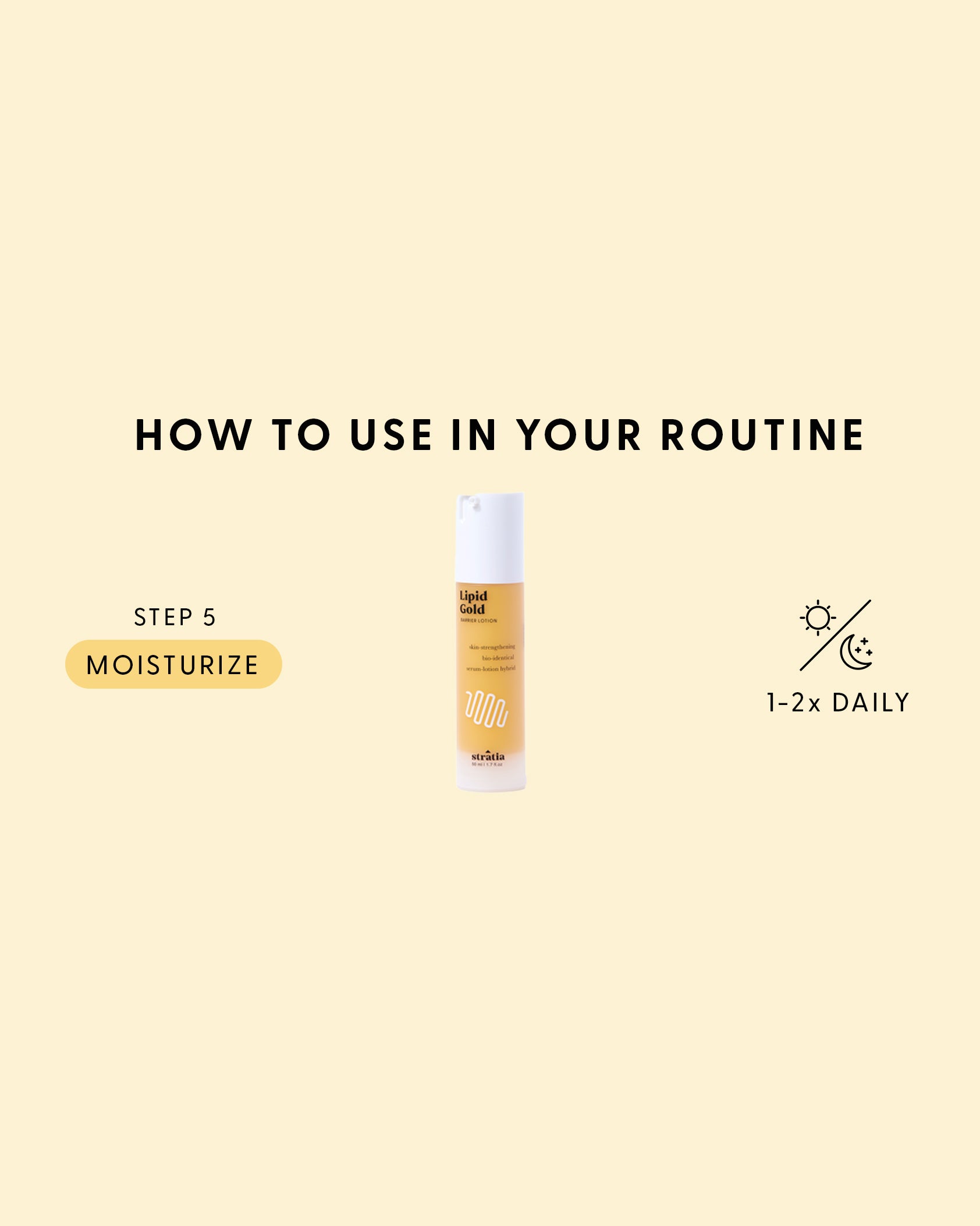 Lipid Gold is formulated with ceramides, cholesterol, and fatty acids to mimic and strengthen your natural moisture barrier. By healing dehydration and replenishing that fatty mixture in your stratum corneum, you can address the above symptoms and discover healthy, bouncy, resilient skin.